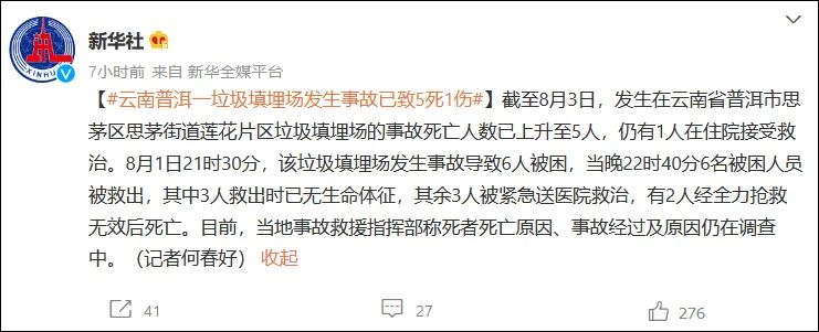 8月1日普洱市思茅區(qū)蓮花片區(qū)垃圾填埋場發(fā)生事故致6人被困目前事故死亡人數(shù)已上升至5人# 事件經過 #8月1日21時30分,普洱市思茅區(qū)相關部門接到報警,思茅街道蓮花片區(qū)垃圾填埋場有人被困。事故發(fā)生后,市委、市政府和思茅區(qū)委、區(qū)政府高度重視,市區(qū)兩級迅速成立“8.01”事故救援指揮部進行現(xiàn)場緊急救援。...
