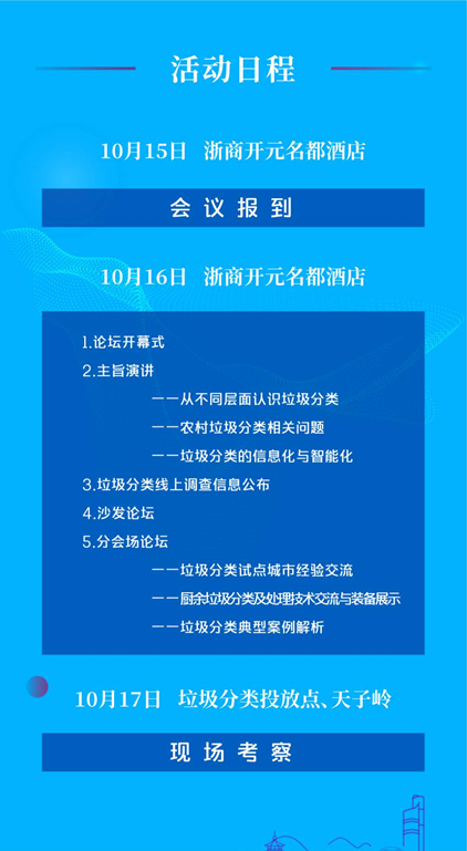 文章導(dǎo)讀中國(guó)城市環(huán)境衛(wèi)生協(xié)會(huì)垃圾分類(lèi)專業(yè)委員會(huì)舉辦的“2020 垃圾分類(lèi)杭州高峰論壇”,將于2020 年 10 月 15 日—17 日在杭州舉行。會(huì)議以“找差距、補(bǔ)短板,強(qiáng)化垃圾分類(lèi)全過(guò)程管理”為主題,將薈萃全國(guó)環(huán)衛(wèi)領(lǐng)域精英,包括中國(guó)城市環(huán)境衛(wèi)生協(xié)會(huì)會(huì)長(zhǎng)徐文龍、中國(guó)城市環(huán)境衛(wèi)生協(xié)會(huì)秘書(shū)長(zhǎng)劉晶昊、中國(guó)...