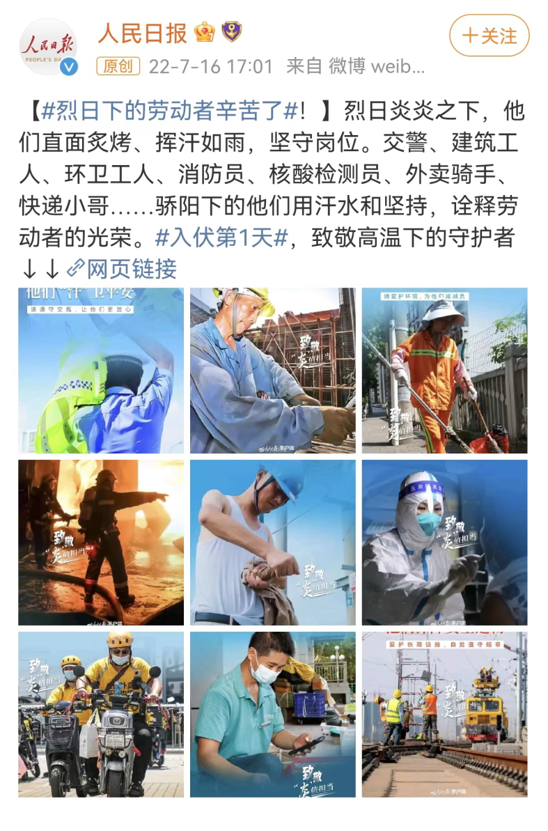 人民日報7月16日消息,烈日炎炎之下,他們直面炙烤、揮汗如雨,堅守崗位。交警、建筑工人、環(huán)衛(wèi)工人、消防員、核酸檢測員、外賣騎手、快遞小哥……驕陽下的他們用汗水和堅持,詮釋勞動者的光榮。來源 | 人民日報編輯 | 匡宋堯