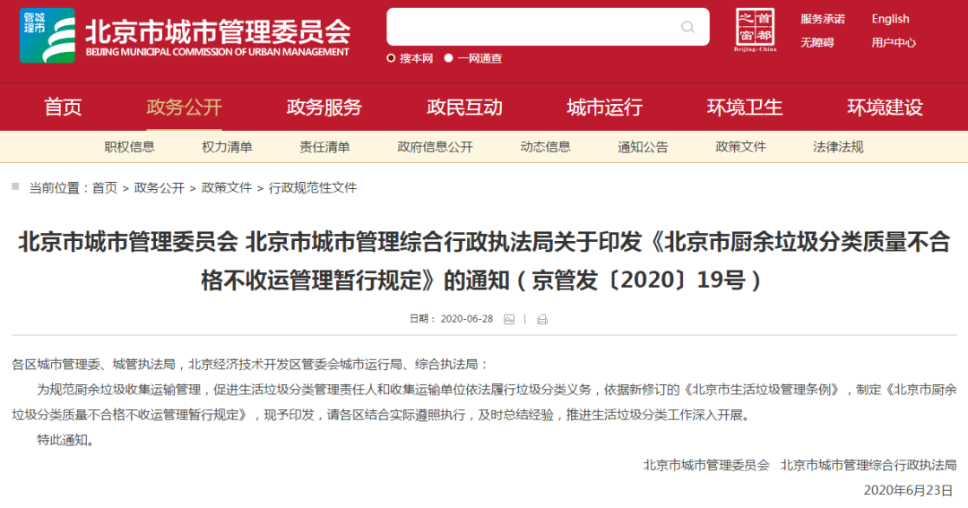 文章導(dǎo)讀為規(guī)范廚余垃圾收集運(yùn)輸管理,促進(jìn)生活垃圾分類(lèi)管理責(zé)任人和收集運(yùn)輸單位依法履行垃圾分類(lèi)義務(wù),依據(jù)《北京市生活垃圾管理?xiàng)l例》,制定《北京市廚余垃圾分類(lèi)質(zhì)量不合格不收運(yùn)管理暫行規(guī)定》。為規(guī)范廚余垃圾收集運(yùn)輸管理,促進(jìn)生活垃圾分類(lèi)管理責(zé)任人和收集運(yùn)輸單位依法履行垃圾分類(lèi)義務(wù),北京市城市管理委員會(huì) 北...