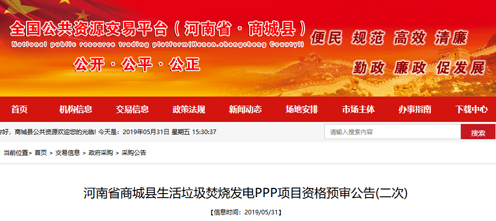 中國環(huán)聯(lián)網(wǎng)獲悉,5月31日,河南省商城縣生活垃圾焚燒發(fā)電PPP項目發(fā)布資格預(yù)審公告(二次)。項目概況及采購內(nèi)容項目名稱:河南省商城縣生活垃圾焚燒發(fā)電PPP項目;采購編號:商財采招字(2018)-147號;采購方式:公開招標 ;建設(shè)內(nèi)容:建設(shè)一座生活垃圾焚燒發(fā)電,一期工程規(guī)模600噸/日,配套一期工程...