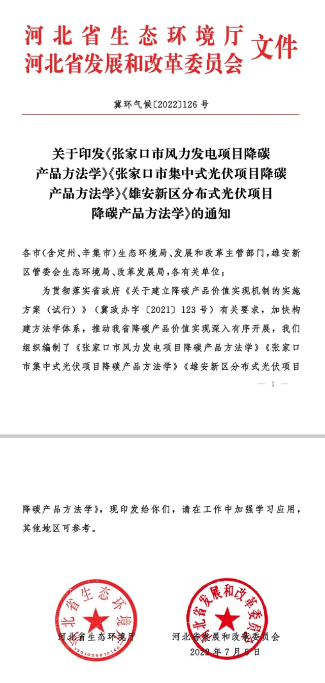 近日,由張家口市生態(tài)環(huán)境局組織編制的《張家口市風(fēng)力發(fā)電項(xiàng)目降碳產(chǎn)品方法學(xué)》和《張家口市集中式光伏項(xiàng)目降碳產(chǎn)品方法學(xué)》,獲河北省生態(tài)環(huán)境廳、河北省發(fā)展改革委聯(lián)合批準(zhǔn)發(fā)布實(shí)施,是2022年河北省首批發(fā)布的降碳產(chǎn)品方法學(xué),也是全國(guó)首個(gè)市級(jí)“綠電”降碳產(chǎn)品方法學(xué)。 今年以來,張家口市...