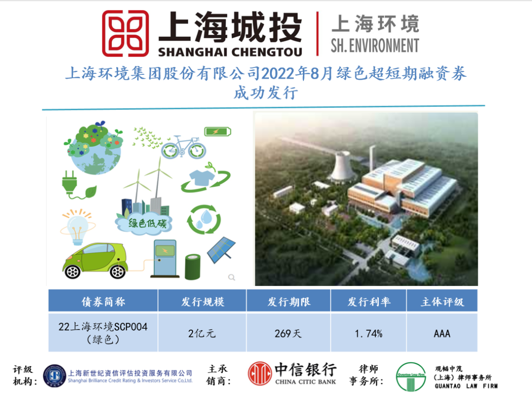 文章導(dǎo)讀8月30日,上海環(huán)境集團(tuán)股份有限公司成功發(fā)行22上海環(huán)境SCP004(綠色),融資規(guī)模2億元,期限269天,用于滿足下屬子公司日常運營的資金需求。本次發(fā)行綠色超短融最終票面利率為年化1.74%。上海環(huán)境通過積極響應(yīng)綠色金融活動,參與經(jīng)濟(jì)社會綠色低碳轉(zhuǎn)型,助力“碳達(dá)峰”、“碳中和”。2021年...