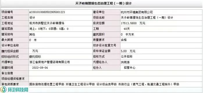 文章轉(zhuǎn)載于:環(huán)衛(wèi)科技網(wǎng)作者:ivy從這份核準(zhǔn)登記文件看,天子嶺填埋場生態(tài)治理工程建設(shè)單位為杭州市環(huán)境集團有限公司,投資總額約1.75億元。筆者通過環(huán)衛(wèi)科技網(wǎng)數(shù)據(jù)平臺查詢后發(fā)現(xiàn),早在2021年8、9月間,天子嶺填埋場生態(tài)治理工程就已進行過一次“場地調(diào)查服務(wù)項目”招標(biāo),彼時中標(biāo)單位為浙江大學(xué)建筑設(shè)計研究...