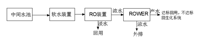 經反滲透處理的濃水,利用離心泵把水打到ROWER膜堆中,在膜堆中通直流電源,利用膜的選擇透過性,使原水中的離子遷移到ROWER濃水中,達到除鹽的目的,ROWER產生的淡水若能滿足系統(tǒng)沖洗回用水的需要,則利用;否則進一步回到生化系統(tǒng)中,繼續(xù)進一步降低COD,從而進一步提高回用水的利用率。