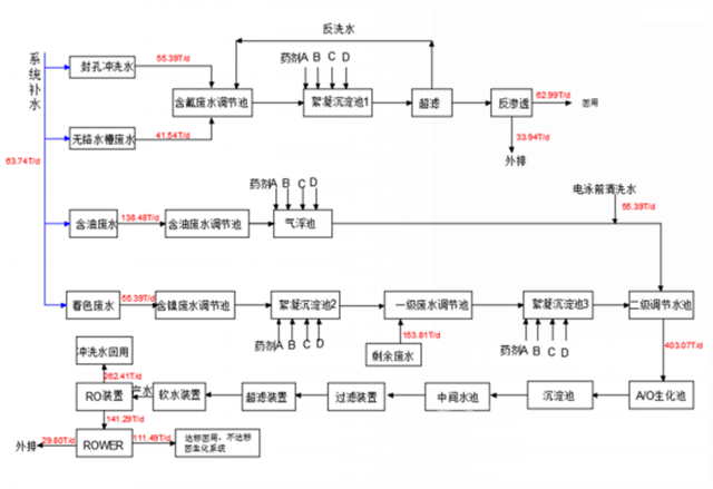 該工程設計按照氧化線處理水量10000噸/月,立式噴涂線處理水量3000噸/月,按每月30天,24小時連續(xù)運行設計整個系統(tǒng)。經過生化系統(tǒng)處理的水,進回用水系統(tǒng),產生的濃水符合排放標準排入市政管網。