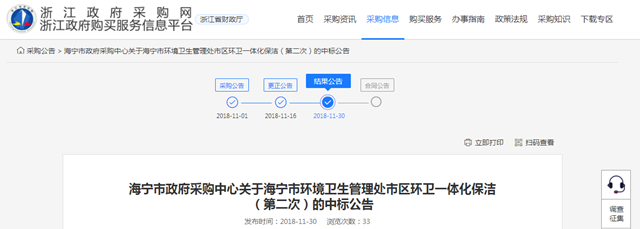 浙江省海寧市環(huán)境衛(wèi)生管理處市區(qū)環(huán)衛(wèi)一體化保潔項目發(fā)布中標(biāo)公告,福建東飛環(huán)境集團(tuán)有限公司成為中標(biāo)的社會資本方,中標(biāo)金額為2.42億,服務(wù)期限為2018年12月01日—2021年11月30日(其中垃圾轉(zhuǎn)運為2019年1月1日—2021年11月30日)。