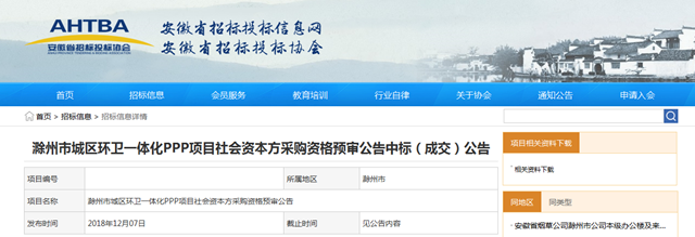 安徽省滁州市城區(qū)環(huán)衛(wèi)一體化PPP項(xiàng)目發(fā)布資格預(yù)審結(jié)果公告,北京環(huán)境、啟迪桑德和軒昂環(huán)保三家企業(yè)入圍。