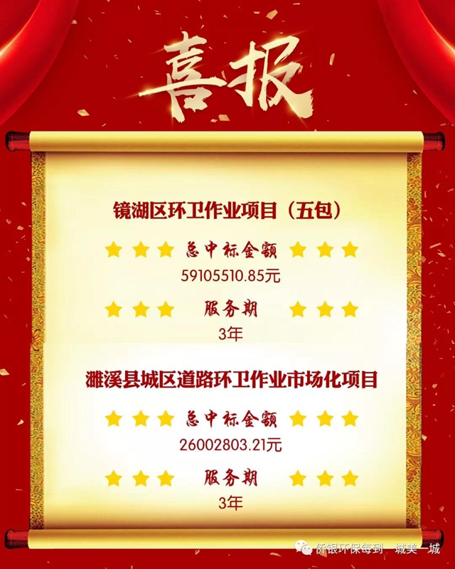 原標(biāo)題:僑銀環(huán)保連中安徽省兩個環(huán)衛(wèi)項目 總金額超過8500萬元