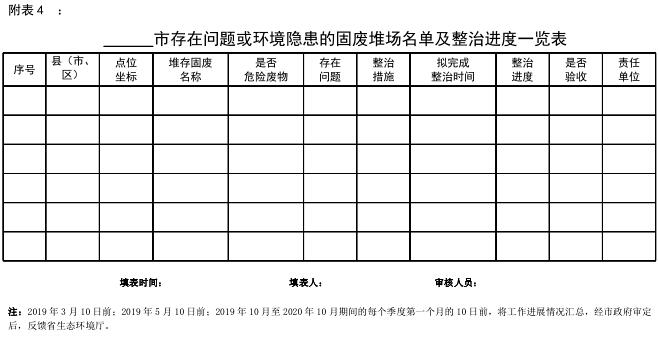 (二)制定整治方案階段(2019 年 4 月底前)。對(duì)排查發(fā)現(xiàn)存在問題和隱患的堆存場(chǎng)所,按照誰產(chǎn)生、誰治理的原則,由責(zé)任主體單位制定環(huán)境整治方案,完善“防揚(yáng)散、防流失、防滲漏”措施,并報(bào)所在地生態(tài)環(huán)境部門備案。無法找到責(zé)任單位的,由當(dāng)?shù)厝嗣裾?fù)責(zé)治理。根據(jù)整治方案完善附表 4 相關(guān)內(nèi)容,2019年 5 月 10 日前,經(jīng)市政府審定后,反饋省生態(tài)環(huán)境廳。