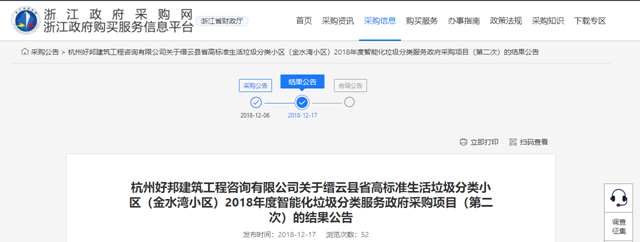 浙江省縉云縣省高標(biāo)準(zhǔn)生活垃圾分類小區(qū)(金水灣小區(qū))2018年度智能化垃圾分類服務(wù)政府采購(gòu)項(xiàng)目發(fā)布結(jié)果公告,浙江聯(lián)運(yùn)環(huán)境工程股份有限公司成為中標(biāo)的社會(huì)資本方,中標(biāo)金額33.45萬(wàn)。