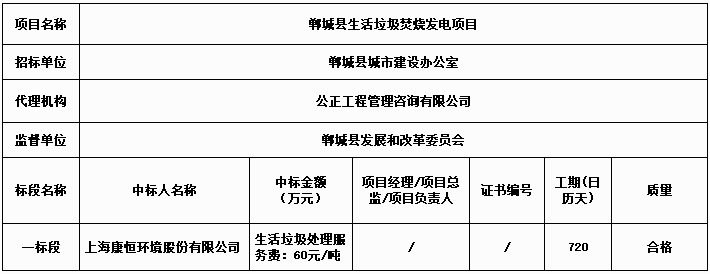 河南省周口市鄲城縣生活垃圾焚燒發(fā)電項(xiàng)目發(fā)布了中標(biāo)公告,上??岛悱h(huán)境股份有限公司成為中標(biāo)的社會(huì)資本方,生活垃圾處理服務(wù)費(fèi)為60元/噸。