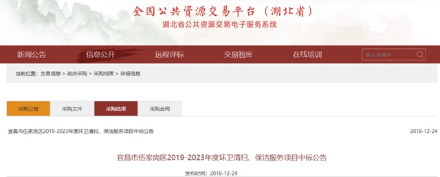 2018年12月24日,湖北省宜昌市伍家崗區(qū)2019-2023年度環(huán)衛(wèi)清掃、保潔服務(wù)項目中標(biāo)公告出爐,北控水務(wù)(中國)投資有限公司成為中標(biāo)的社會資本方,中標(biāo)金額為2.24億。