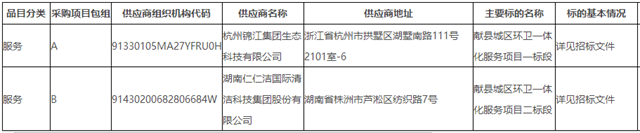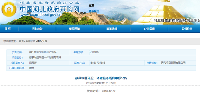 2018年12月27日,河北省獻縣城區(qū)環(huán)衛(wèi)一體化服務(wù)項目發(fā)布中標(biāo)公告。錦江生態(tài)斬獲A包,中標(biāo)金額為1036.33萬/年,服務(wù)期限3年。
