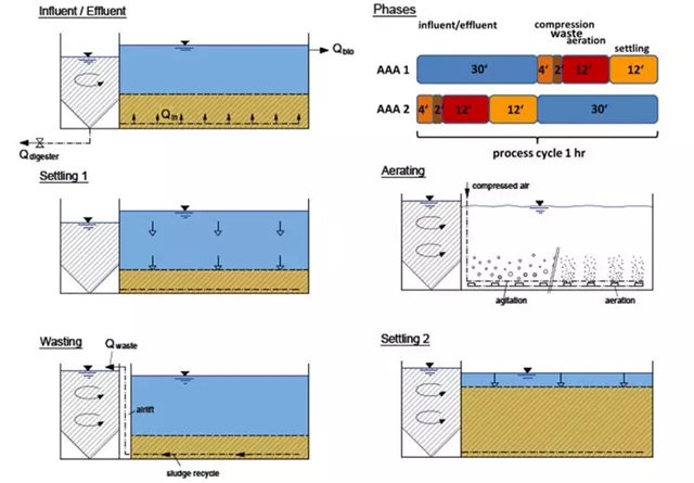 下圖是該系統(tǒng)的一個過程循環(huán)(小編個人認為本質就是個SBR系統(tǒng))時間通常約1小時。每個循環(huán)包括五個階段:進水/出水(30分鐘)、壓縮、排泥、進氣和靜置。出水由進水驅動,而所有其他過程都是空氣驅動的,包括曝氣和混合、氣浮排泥,氣封潷水等。曝氣有溶解氧控制,標準點設為1 mg /L。排泥時間視乎活性沉淀池中的實際污泥含量,并根據(jù)總固體濃度的在線測量數(shù)據(jù)作自動調整。