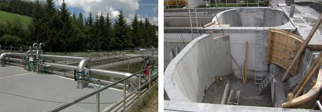 意大利Alta Badia污水廠:左側是其外觀,右側展示現(xiàn)有初沉池的污泥料斗區(qū)改造成污泥濃縮池的情況。 | 圖源:NEWport