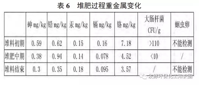表6可以看出,砷、鉛、鎘、鉻的含量都降低了,說明在堆肥過程中,大部分重金屬都得到鈍化,所以含量降低。但金屬汞的含量卻有所增加,這是因?yàn)樵诙逊蔬^程中水分和揮發(fā)性物質(zhì)損失,以及堆肥后堆體體積變小,引起該金屬在堆體中濃縮所致。
