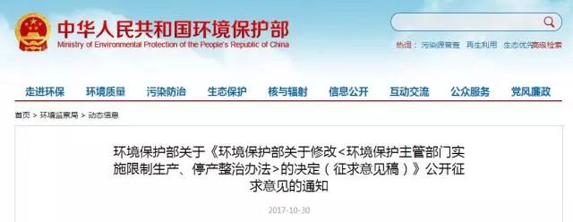 2017年10月30日,環(huán)境保護(hù)部網(wǎng)站公布修改《環(huán)境保護(hù)主管部門實(shí)施限制生產(chǎn)、停產(chǎn)整治辦法》的決定(征求意見(jiàn)稿)(以下簡(jiǎn)稱“征求意見(jiàn)稿”),并向社會(huì)公開(kāi)征求意見(jiàn)。