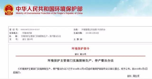 《環(huán)境保護(hù)主管部門實(shí)施限制生產(chǎn)、停產(chǎn)整治辦法》已于2014年12月15日由環(huán)境保護(hù)部部務(wù)會(huì)議審議通過(guò),現(xiàn)予公布,自2015年1月1日起施行。