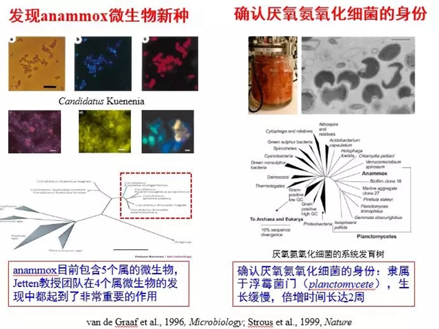 Anammox現(xiàn)象被發(fā)現(xiàn)之后,Kuenen教授的一位主要助手Mike Jetten博士專注于Anammox的微生物學(xué)研究,并在加盟荷蘭奈梅亨大學(xué)微生物系之后,組織團隊展開了長期的基礎(chǔ)研究工作,發(fā)現(xiàn)和培養(yǎng)了新的參與氮、硫和碳轉(zhuǎn)化的微生物,采用分子生物學(xué)、結(jié)構(gòu)化學(xué)和宏基因組學(xué)從基因、細胞、個體和生態(tài)系統(tǒng)水平揭示相關(guān)微生物的反應(yīng)機理。