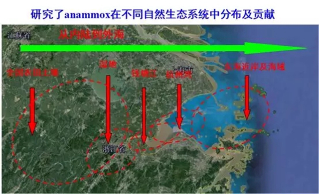 鄭平教授以前的學(xué)生--浙江大學(xué)胡寶蘭教授研究了Anammox細菌在中國不同自然生態(tài)系統(tǒng)中的分布及貢獻。她發(fā)現(xiàn),Anammox細菌廣泛存在于不同的自然生境中,且沉積物的有機碳和無機氮是影響Anammox分布的主要因素。她還發(fā)現(xiàn)人類活動影響了Anammox菌的分布,甚至特定Anammox菌可作為人類活動的指示菌。