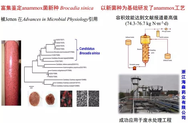 鄭平教授團隊改進的Anammox工藝容積效能達到文獻報道最高值(74.3~76.7kg N·m-3·d),并成功應(yīng)用于浙江的海森藥業(yè)有限公司廢水處理工程,這是中國第一個厭氧氨氧化廢水處理的實際工程。