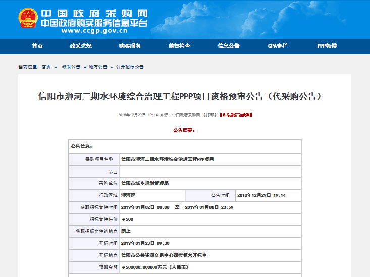 原標(biāo)題:預(yù)算50億!河南浉河水環(huán)境綜合治理PPP項目開始招標(biāo)