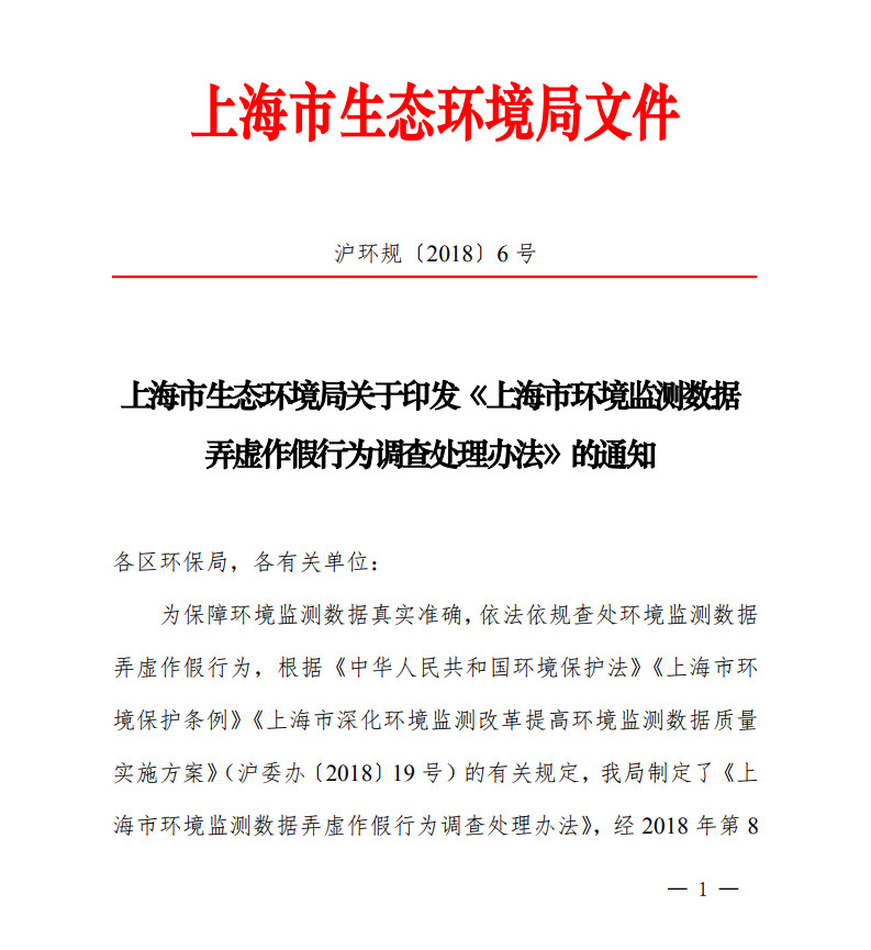 日前,上海市生態(tài)環(huán)境局印發(fā)了《上海市環(huán)境監(jiān)測數(shù)據(jù)弄虛作假行為調(diào)查處理辦法》,全文如下: