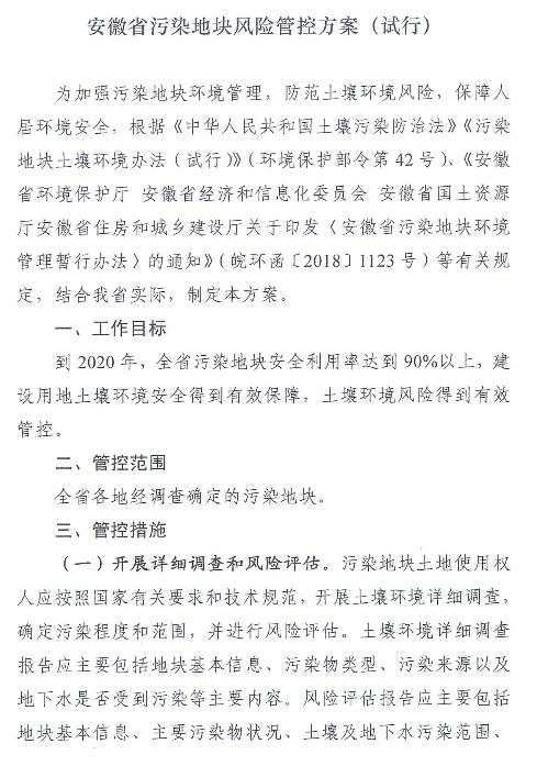 日前,安徽印發(fā)《安徽省污染地塊風險管控方案》,旨在加強土壤污染防治。全文如下:
