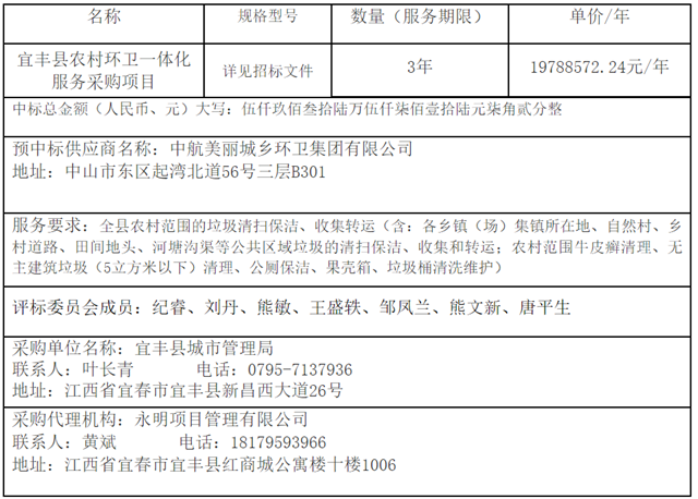 原標(biāo)題:1979萬元/年,江西宜豐縣農(nóng)村環(huán)衛(wèi)項(xiàng)目中標(biāo)公示