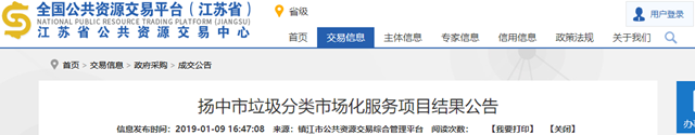 2019年1月9日,江蘇省揚中市垃圾分類市場化服務項目發(fā)布結果公告,浙江聯(lián)運環(huán)境工程股份有限公司成為中標的社會資本方,中標金額為897.5萬,服務期限3年。
