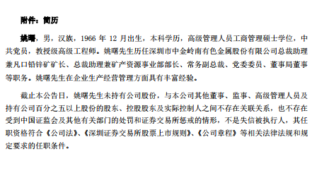 姚曙,男,漢族,1966年12月出生,本科學(xué)歷,高級管理人員工商管理碩士學(xué)位,中共黨員,教授級高級工程師。姚曙歷任深圳市中金嶺南有色金屬股份有限公司總裁助理兼凡口鉛鋅礦礦長、總裁助理兼礦產(chǎn)資源事業(yè)部部長、常務(wù)副總裁、黨委委員、董事局董事等職務(wù)。其在企業(yè)生產(chǎn)經(jīng)營管理方面具有豐富經(jīng)驗。