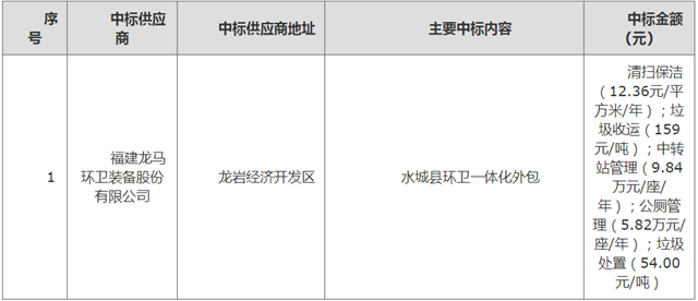 貴州水城縣城鄉(xiāng)環(huán)衛(wèi)項目評標(biāo)工作結(jié)束,龍馬環(huán)衛(wèi)中標(biāo),中標(biāo)金額:清掃保潔(12.36元/平方米/年);垃圾收運(yùn)(159元/噸);中轉(zhuǎn)站管理(9.84萬元/座/年);公廁管理(5.82萬元/座/年);垃圾處置(54.00元/噸),項目采購預(yù)算高達(dá)12億元。