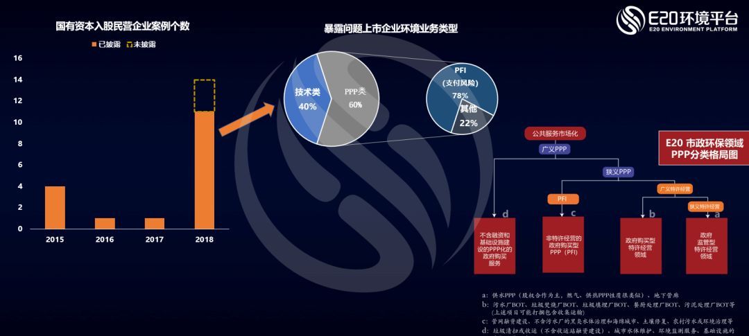 接著,薛濤對(duì)近年來發(fā)生的國有資本入資上市民企(參股及控股)情況進(jìn)行了簡要分析。首先從下圖所顯示的數(shù)量上來看,前幾年發(fā)生的頻率均較低,但進(jìn)入2018年以來已經(jīng)超過10起,這與今年的金融、政策等大環(huán)境的變化息息相關(guān)。但進(jìn)一步拆分來看,2018年發(fā)生的事件中有40%是技術(shù)類企業(yè),沒有做任何類型的PPP,與PPP無關(guān)。而在與PPP相關(guān)的剩余60%的企業(yè)中,PFI模式成為主因的比例又達(dá)到了78%的比例,這些企業(yè)在前些年P(guān)PP高速增長階段由于大量承接PFI項(xiàng)目帶來了大幅的業(yè)績?cè)鲩L。但近年來由于金融、政策等大環(huán)境的變化導(dǎo)致過多PFI項(xiàng)目在手的這類企業(yè)受到了較大的沖擊,其中民企由于融資短板而受到了更大的影響,也才帶來這些事件的發(fā)生。合計(jì)評(píng)估,本輪PPP中的新增類型--PFI模式,結(jié)合資本泡沫的大起大落,確實(shí)是構(gòu)成2017年以來環(huán)保領(lǐng)域本輪國進(jìn)民退的主因。