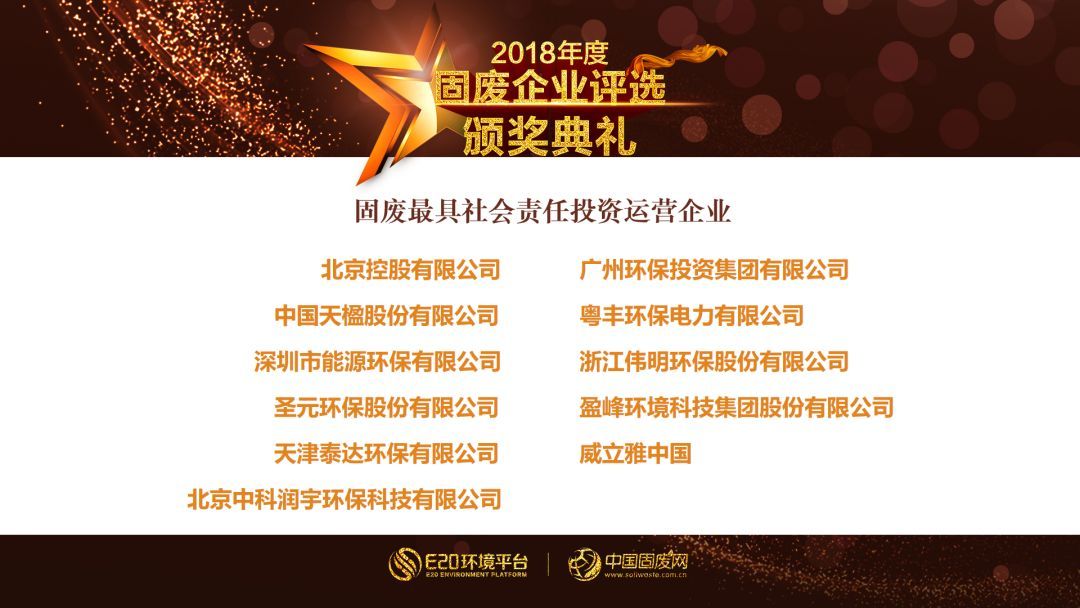根據(jù)各項(xiàng)指標(biāo)綜合評(píng)估,我們隆重祝賀今年的年度固廢影響力企業(yè)、固廢最具社會(huì)責(zé)任投資運(yùn)營企業(yè):