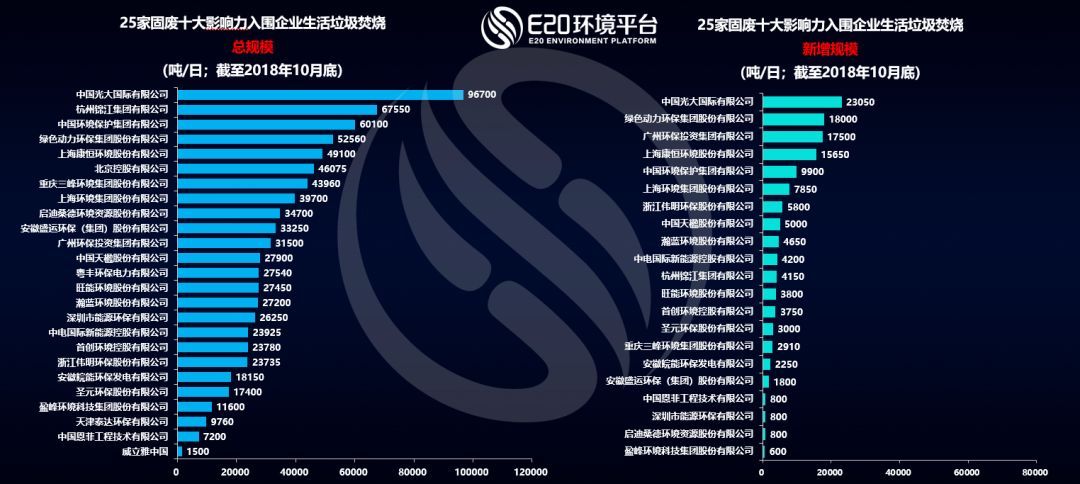 那么,回到2018年度的業(yè)績盤點(diǎn)。據(jù)E20數(shù)據(jù)中心統(tǒng)計(jì),25家固廢十大影響力入圍企業(yè)的垃圾焚燒業(yè)績?nèi)缦聢D所示: