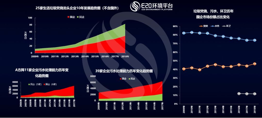 上圖所示為E20研究院數(shù)據(jù)中心統(tǒng)計(jì)近年來我國生活垃圾焚燒及污水處理行業(yè)國企及民企業(yè)績?cè)鲩L的變化。右圖中可以看到,國企市場(chǎng)占比基本穩(wěn)定,污水處理行業(yè)保持在75%左右(這次E20研究院數(shù)據(jù)中興加入了39家來分析十年的國進(jìn)民退走勢(shì),與左側(cè)之前的11家的統(tǒng)計(jì)有很大的不同,值得關(guān)注),垃圾焚燒行業(yè)保持在45%左右,環(huán)衛(wèi)則穩(wěn)定在12%。