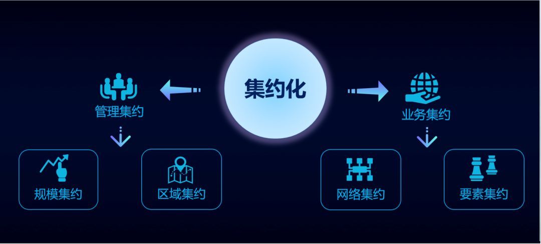 為了深入分析如何達(dá)成提高運(yùn)營長期效率這個(gè)目標(biāo),E20研究院將其集約化類型劃分為兩大類,四小類進(jìn)行解析。分別是管理集約型,包括區(qū)域集約型和規(guī)模集約型兩類;業(yè)務(wù)集約型,包括網(wǎng)絡(luò)集約型和要素集約型兩類。總體來講,集約化的核心就是集中管理,提高效率。