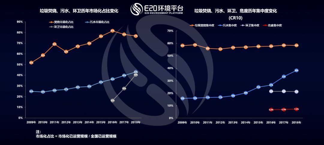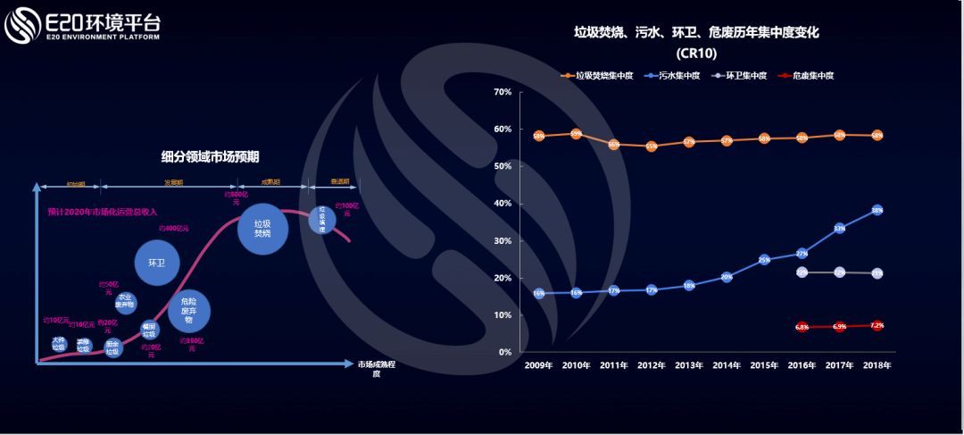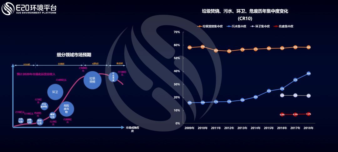 而通過E20研究院數(shù)據(jù)中心對(duì)各細(xì)分領(lǐng)域龍頭企業(yè)的跟蹤調(diào)研發(fā)現(xiàn),我國生活垃圾焚燒領(lǐng)域市場(chǎng)集中度CR10(前十家企業(yè)的市場(chǎng)占有率之和)近10年來穩(wěn)定在58%左右;污水處理行業(yè)集中度CR10持續(xù)增長,至2018年達(dá)到38%左右;環(huán)衛(wèi)行業(yè)和危廢行業(yè)的市場(chǎng)集中度CR10均基本穩(wěn)定,分別保持在20%和7%左右,市場(chǎng)仍較分散,這個(gè)原因是市場(chǎng)釋放非???,新進(jìn)入者眾多,仍處于行業(yè)的快速上升期。