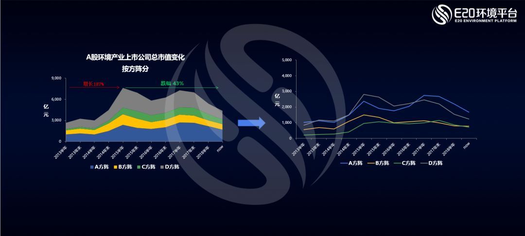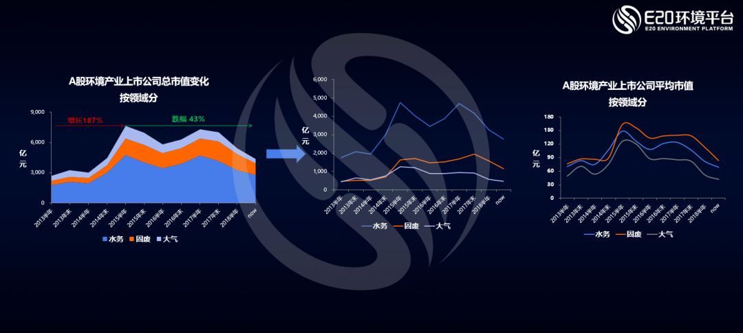 首先薛濤從上市公司角度分析了目前A股環(huán)保板塊的現(xiàn)狀。下面的左圖中可以看到,自2018年以來,環(huán)保板塊的整體市值已縮水43%,是所有板塊中跌幅最大的板塊之一,這一現(xiàn)狀也引來各家券商行研“環(huán)保是最大的雷”的總結(jié)。