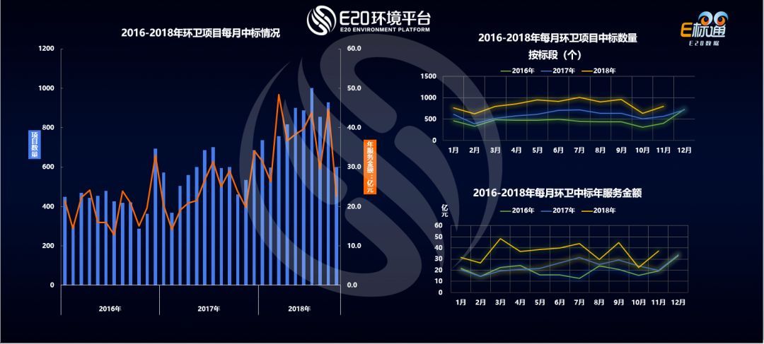 上圖可見,根據(jù)E20環(huán)境平臺(tái)E標(biāo)通對(duì)近三年的數(shù)據(jù)分析,可以看出,環(huán)衛(wèi)項(xiàng)目每個(gè)月的中標(biāo)數(shù)量呈現(xiàn)在波動(dòng)中上升趨勢(shì),這與E20研究院對(duì)環(huán)衛(wèi)市場(chǎng)化發(fā)展的趨勢(shì)預(yù)判高度吻合。中標(biāo)金額也呈上揚(yáng)趨勢(shì),環(huán)衛(wèi)市場(chǎng)火熱程度可見一斑。