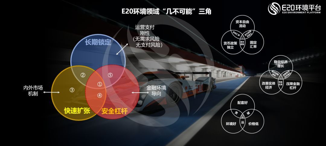 正如前面所講,為主導(dǎo)朋友圈自媒體往往充斥了各種恐慌,比如廣泛流傳的外匯不可能三角、金融市場(chǎng)不可能三角、以及房地產(chǎn)不可能三角理論體系。不過,這種三角模型很符合E20研究院所習(xí)慣的圖形邏輯組合的分析思路,所以我們回顧過去,也為環(huán)境企業(yè)家總結(jié)了 “E20環(huán)境領(lǐng)域‘幾不可能’三角“。結(jié)合前面提到的PPP方面的研究,E20研究院選取了長期鎖定、快速擴(kuò)張以及安全杠桿作為構(gòu)建“E20環(huán)境領(lǐng)域幾不可能三角”的三個(gè)要素。這三個(gè)要素的綜合內(nèi)外分析對(duì)于任何環(huán)保企業(yè),無論是技術(shù)型企業(yè)還是投資運(yùn)營型企業(yè),都可以作為戰(zhàn)略規(guī)劃的參考。(相關(guān)閱讀→ 讀薛濤解析環(huán)保PPP之“幾不可能三角”:思維碰撞殊途同歸)