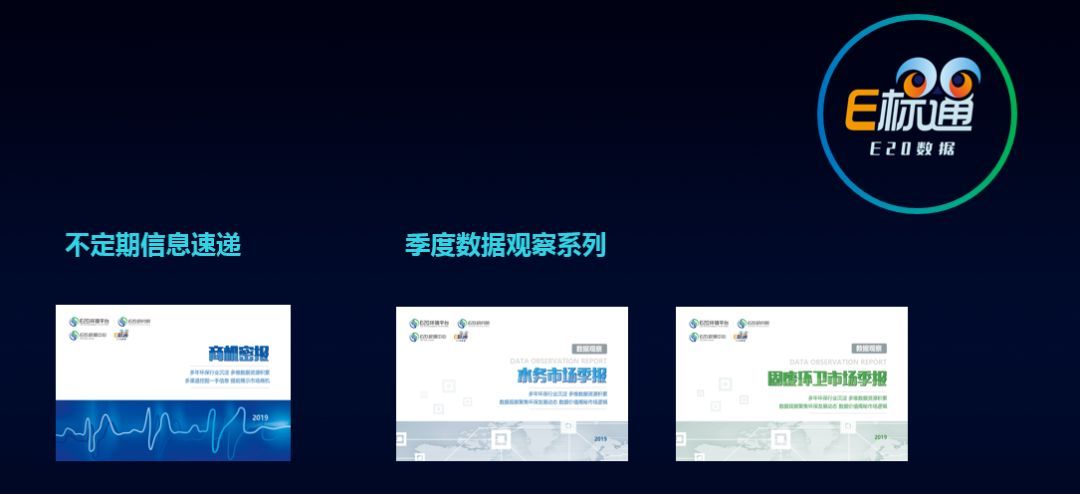 E20研究院數(shù)據(jù)中心將以E標(biāo)通為基礎(chǔ),從環(huán)衛(wèi)市場(chǎng)化機(jī)會(huì)出發(fā),兼顧污水、垃圾等投資運(yùn)營細(xì)分領(lǐng)域,并逐步擴(kuò)展到工程、設(shè)備等各細(xì)分領(lǐng)域,為圈層會(huì)員企業(yè)提供免費(fèi)“環(huán)衛(wèi)商機(jī)密報(bào)”、“水務(wù)市場(chǎng)季度觀察”、“固廢環(huán)衛(wèi)市場(chǎng)季度觀察”等數(shù)據(jù)產(chǎn)品,敬請(qǐng)期待。