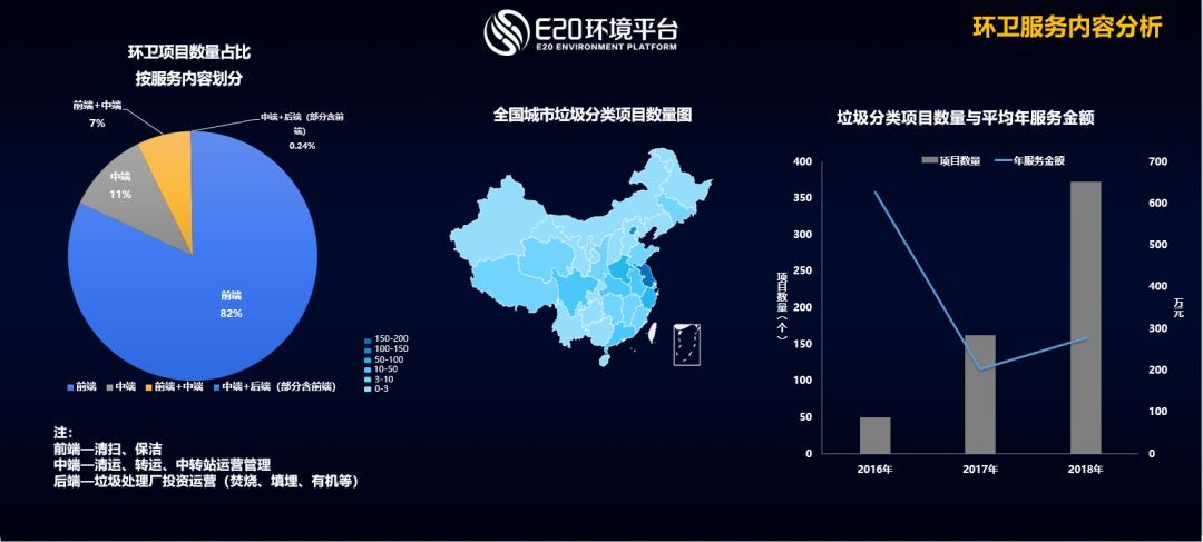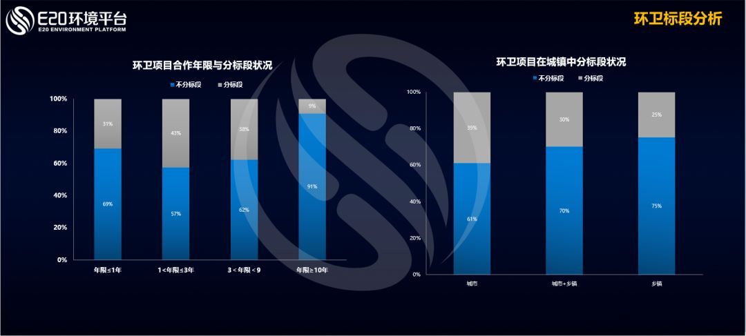 從標(biāo)段情況分析,合作年限在1~3年的項(xiàng)目分標(biāo)段的比例最高,從行政區(qū)劃來看,環(huán)衛(wèi)項(xiàng)目在城市中分標(biāo)段的比例較高。從服務(wù)內(nèi)容來看,前端的業(yè)務(wù),也就是清掃保潔的業(yè)務(wù)占82%,中端業(yè)務(wù)11%,中端加后端0.24%。
