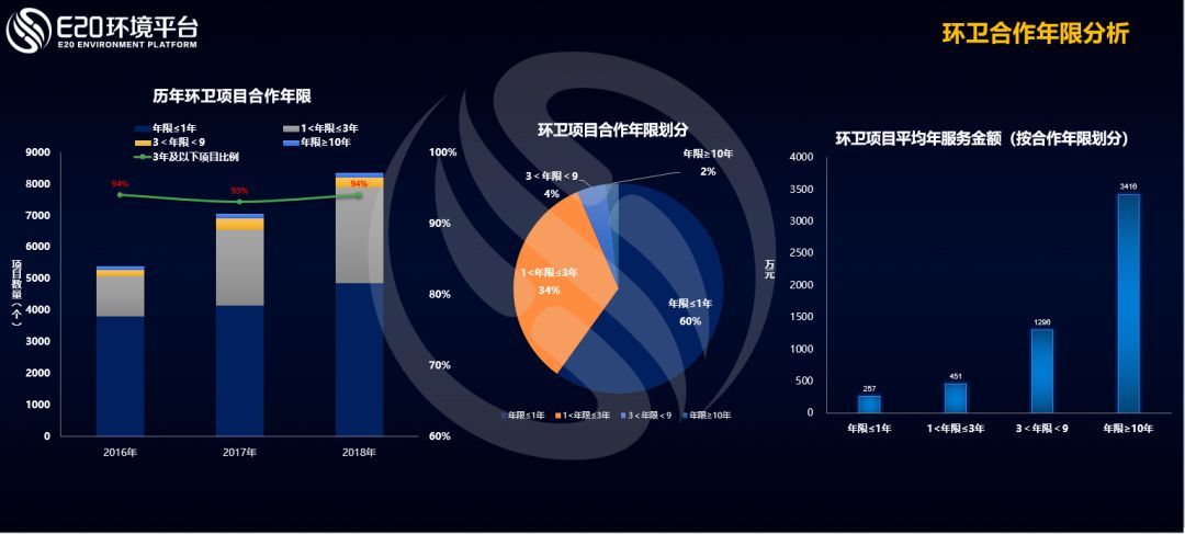 從合作年限來看,歷年環(huán)衛(wèi)項(xiàng)目合作年限分布總體穩(wěn)定,一年期及三年以內(nèi)的項(xiàng)目數(shù)量有一定增加。上圖的中間餅圖中可以看到近三年的數(shù)據(jù),有2%的環(huán)衛(wèi)項(xiàng)目是十年以上的PPP項(xiàng)目。