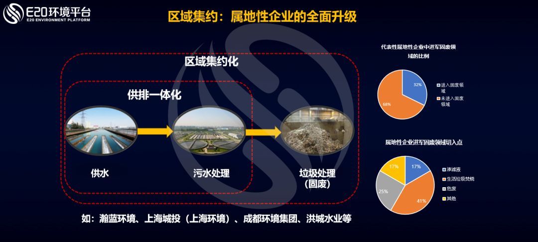 區(qū)域集約指同區(qū)域內(nèi)的管理集約,包括同要素和不同要素集約,主要實(shí)施主體是區(qū)域性環(huán)境綜合服務(wù)商(E20環(huán)境產(chǎn)業(yè)B方陣等),其屬地性、區(qū)域性強(qiáng),企業(yè)一般由當(dāng)?shù)貒Y委控股,不通過競爭性招標(biāo)直接承接區(qū)域內(nèi)項(xiàng)目。區(qū)域集約主要是屬地型企業(yè)的全面升級(jí),這些企業(yè)往往從供水開始,逐步進(jìn)入污水處理,再進(jìn)入垃圾處理行業(yè)。