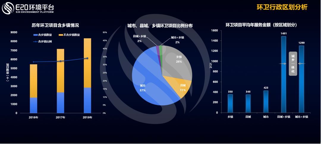 從上圖顯示的行政區(qū)劃的角度看,我國環(huán)衛(wèi)項(xiàng)目鄉(xiāng)鎮(zhèn)的比例總體穩(wěn)定,略有上揚(yáng),項(xiàng)目數(shù)量在2018年達(dá)到了新高。凡是城鄉(xiāng)一體化項(xiàng)目的平均年服務(wù)金額均高于其他項(xiàng)目,這也說明城鄉(xiāng)一體化服務(wù)帶來了更大的合同空間。