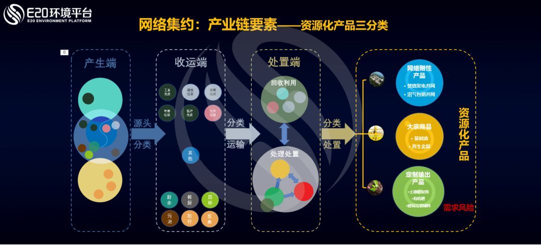 上圖對(duì)城市各種固廢的網(wǎng)絡(luò)集約進(jìn)行了總結(jié),其中廢物實(shí)現(xiàn)資源化的模式我們進(jìn)行了分類,可分為網(wǎng)絡(luò)剛性產(chǎn)品、大宗產(chǎn)品以及定制輸出產(chǎn)品。網(wǎng)絡(luò)剛性產(chǎn)品包括焚燒發(fā)電并網(wǎng),沼氣包銷并網(wǎng);大宗產(chǎn)品包括基礎(chǔ)油,再生金屬等;定制輸出產(chǎn)品包括土壤修復(fù)劑,有機(jī)肥,建筑垃圾輔料等。其中,對(duì)于網(wǎng)絡(luò)剛性產(chǎn)品和大宗產(chǎn)品,都不太用考慮后端消納的痛點(diǎn)(即不需要面對(duì)資源化產(chǎn)品銷售的需求風(fēng)險(xiǎn)),然而定制輸出類產(chǎn)品則在這個(gè)方面成為痛點(diǎn),也是屬于網(wǎng)絡(luò)集約所提供的可持續(xù)開發(fā)和差異化競爭的市場(chǎng)機(jī)會(huì)。