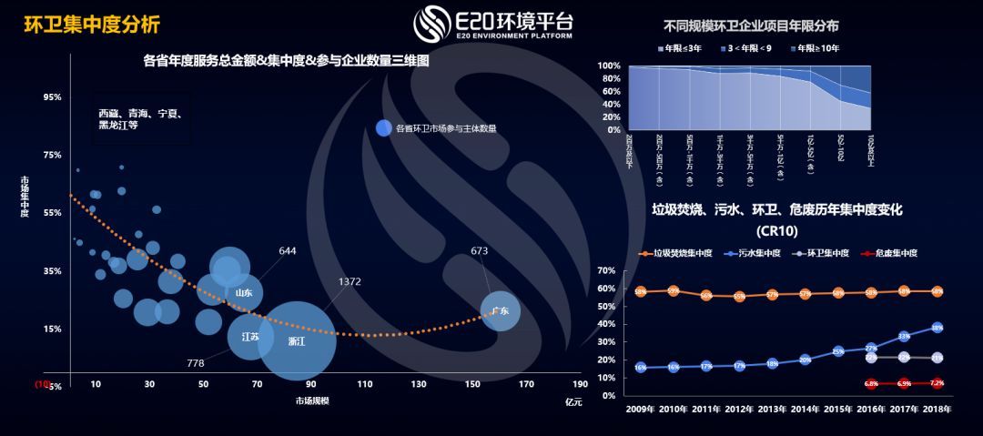 上圖顯示,環(huán)衛(wèi)集中度呈現(xiàn)一個(gè)反拋物線的狀態(tài)。在每個(gè)省來看,當(dāng)環(huán)衛(wèi)市場(chǎng)化項(xiàng)目剛剛出現(xiàn)的時(shí)候,大概只有一兩家、兩三家企業(yè)去參與,或者少數(shù)企業(yè)來參與。市場(chǎng)發(fā)展到一定程度,例如圖中浙江省,開始出現(xiàn)大量項(xiàng)目的時(shí)候,集中度會(huì)下降,比如浙江有1372家環(huán)衛(wèi)企業(yè)。而隨著市場(chǎng)化的推進(jìn),市場(chǎng)規(guī)模進(jìn)一步擴(kuò)大之后,寡頭壟斷開始逐步出現(xiàn),行業(yè)集中度出現(xiàn)上揚(yáng),大企業(yè)龍頭效應(yīng)出現(xiàn)。比如廣東作為市場(chǎng)規(guī)模最大的省份,其參與主體開始減少,集中度會(huì)上揚(yáng)。對(duì)不同年限項(xiàng)目的歸屬進(jìn)行分析來看,環(huán)衛(wèi)行業(yè)雖然小企業(yè)很多,但是10年以上大體量大項(xiàng)目大都被大型企業(yè)握在手中。(相關(guān)鏈接→ 啟迪桑德年報(bào)看點(diǎn):環(huán)衛(wèi)業(yè)務(wù)漲125%,圍繞環(huán)衛(wèi)及物流買買買)