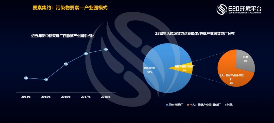 通過近幾年的數(shù)據(jù)觀察,我們發(fā)現(xiàn)新中標(biāo)焚燒廠在靜脈產(chǎn)業(yè)園中的占比正在逐漸提升,2018年已達(dá)14%。目前,垃圾焚燒十大影響力企業(yè)在靜脈產(chǎn)業(yè)園中的焚燒廠占比已達(dá)6%。同時(shí),我們還觀察到循環(huán)經(jīng)濟(jì)產(chǎn)業(yè)園模式已成為新進(jìn)入的實(shí)力強(qiáng)勁的非垃圾焚燒影響力企業(yè)(如盈峰、雅居樂)在固廢處理行業(yè)激烈競爭中彎道超車的一種打法。